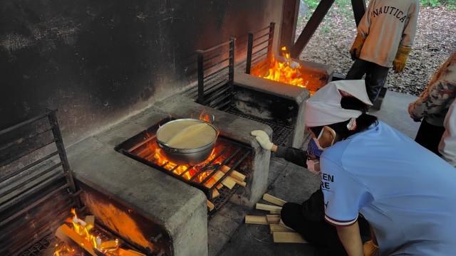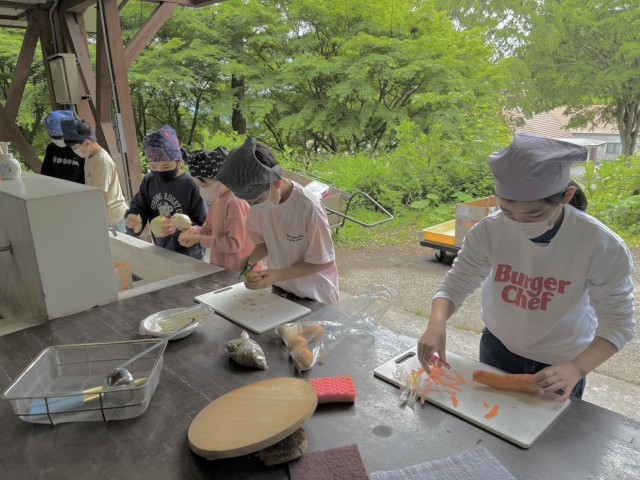 グループごとに協力して、カレーを作りました。野菜の皮をむき、切って鍋に入れました。火を起こして、煮る作業など分担して頑張りました。