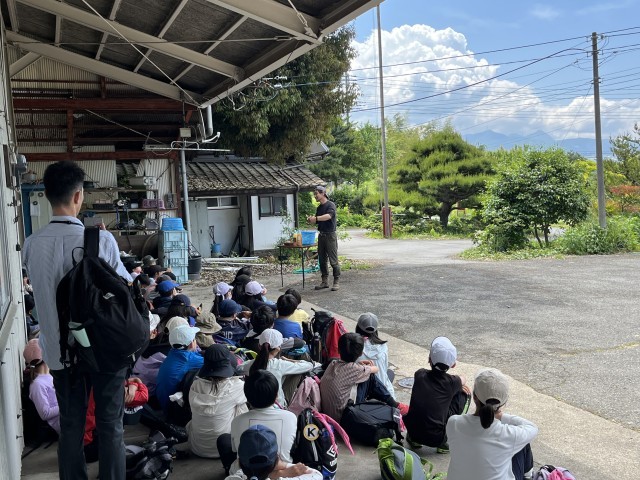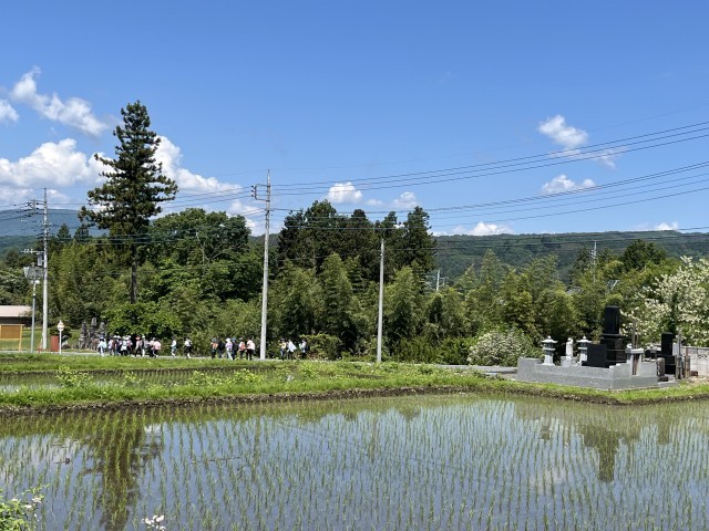 クラスごとに、ガイドの方の案内で川場村を歩いています。