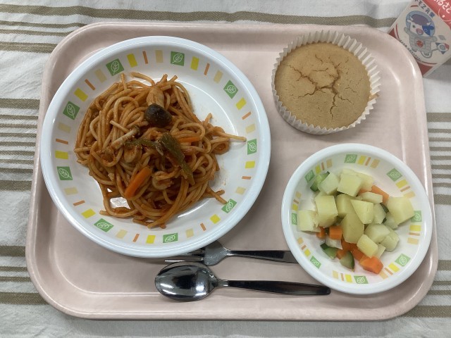 スパゲッティナポリタン じゃが芋サラダ 米粉のきなこ蒸しケーキ 牛乳