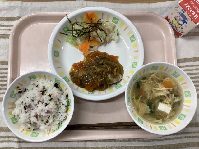 梅わかめごはん サワラの野菜あんかけ かきたま汁 キャベツの海苔和え 牛乳