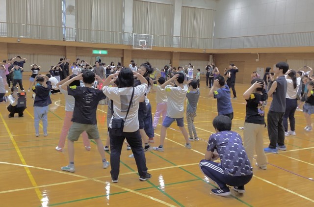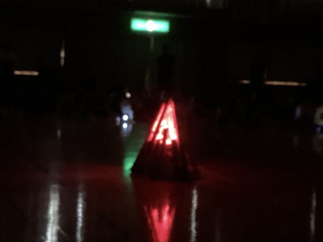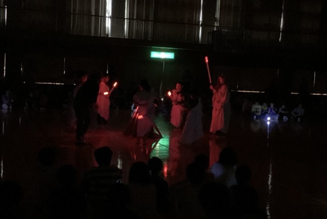 体育館でのキャンドルファイヤー。火の神と火の子が登場して点火の後、歌やダンス、ゲームなどで楽しみました。