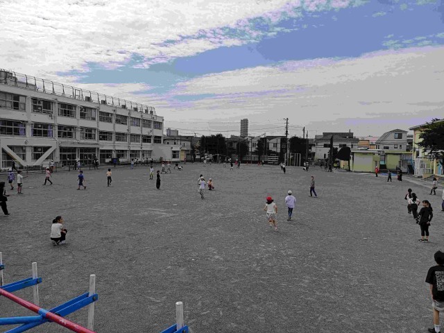校庭を目一杯使い、楽しそうにクラスで体を動かしています。