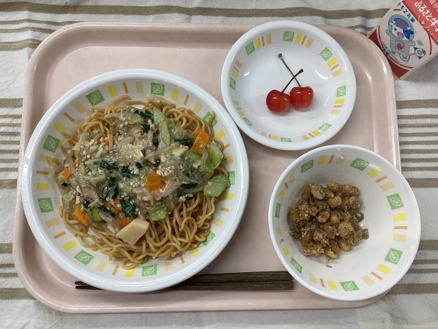 青菜とひき肉の焼きそば 大豆とじゃこの甘辛揚げ さくらんぼ 牛乳