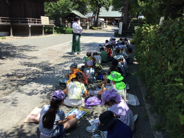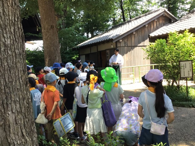 松陰神社では、神職の方に松陰神社の創建当時の事や、神社の仕事などについて教えていただいてから、本堂、松下村塾の模造、吉田松陰先生のお墓を見学しました。毎日神職の方々が丁寧に掃除を行なっている神社は、清々しい空気が流れており、厳かな雰囲気の中、子どもたちは神社の歴史や、吉田松陰先生の偉大さを学ぶことができました。