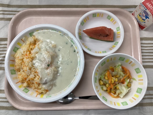 キャロットライスのクリームライスかけ コーンサラダ 小玉すいか 牛乳