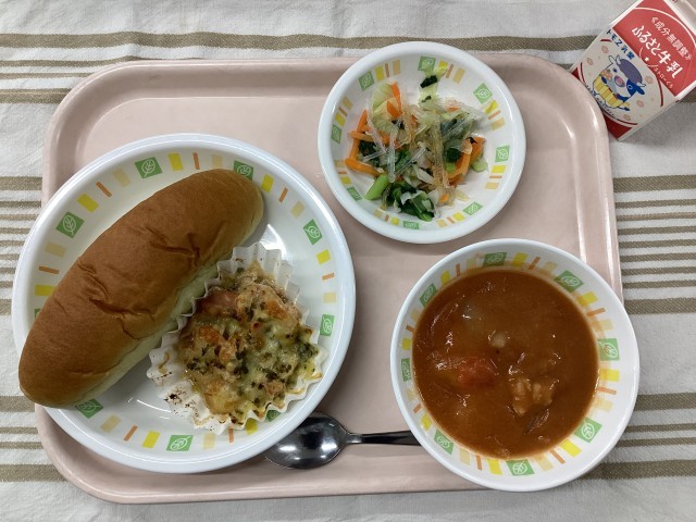 明日葉パン 鮭の和風チーズポテト チキントマトシチュー 糸寒天のレモン酢和え 牛乳