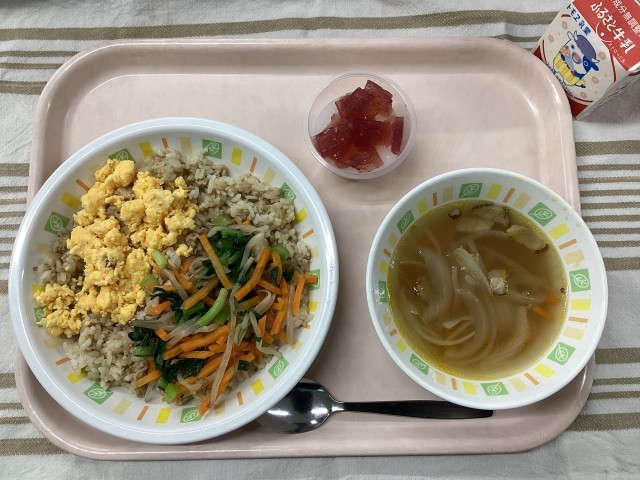 二色そぼろごはん オニオンスープ あじさいゼリー 牛乳