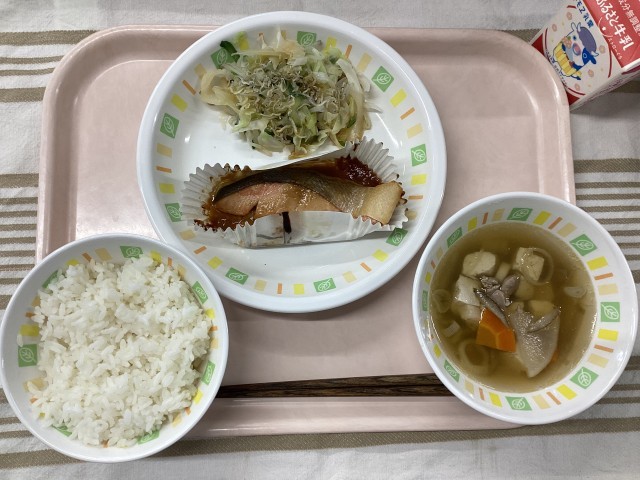 有機米のごはん 鮭のみそマヨネーズ焼き けんちん汁 じゃこ和え 牛乳