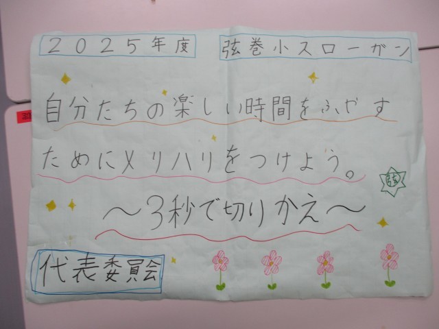 続いて、代表委員会の児童が、今年の弦巻小学校スローガンについて発表しました。自分たちの学校生活を振り返り、どんな学校にしたいか委員会の時間に話し合って決めたそうです。