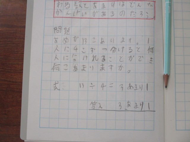 割り算の「あまり」というのはどのようなことなのか、みんなで考えながら学習に取り組んでいました。