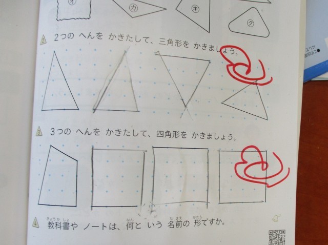 最後は、学んだことを生かして三角形と四角形をかきました。