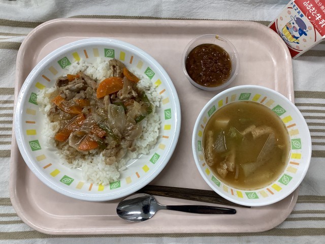 豚肉のしょうが焼き丼 冬瓜のみそ汁 黒糖寒天 牛乳