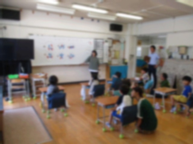 「5」がいくつといくつに分けることができるか、赤と青のペンを5本とって色別に並べて学習しました。