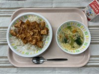 生揚げの四川煮丼 中華風たまごスープ 牛乳胚芽米(岩手)にんにく(青森)しょうが...