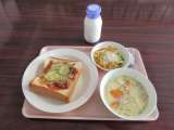 今日の献立 アーモンドトースト 牛乳 チーズのふわふわスープ コーンサラダ 使...