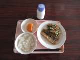 今日の献立 ごはん 牛乳 さんまのかば焼き 野菜のごま和え くだもの(柿) 使...