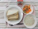 二色サンド(クリームチーズ・いちごジャム) 長ねぎのポタージュ にんじんのラペ ...