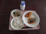 今日の献立 ごはん 牛乳 サバの味噌煮 じゃがいもの甘辛煮 野菜のからし醤油かけ...