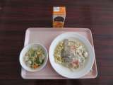 今日の献立 生パスタのホワイトソースかけ オレンジジュース ポテト入りフレンチサ...