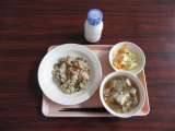 今日の献立 豚とごぼうのごはん 牛乳 けんちん汁 はくさいの甘酢かけ 使用した...
