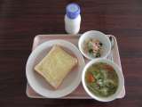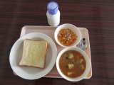 今日の献立 ガーリックトースト 牛乳 ベーコンと野菜のスープ ビーンズサラダ ...