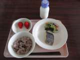 今日の献立 赤飯(せきはん) 牛乳 くだもの(いちご) さわらの西京焼き 野菜の...