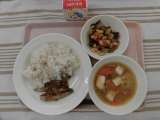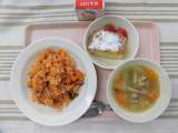 チキンライス 野菜スープ お芋のケーキ いちご 牛乳 〜今年度最後の給食〜 米...