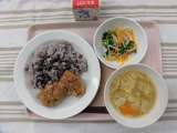 赤飯 鶏肉のから揚げ かきたま汁 菜花のおひたし 米・もち米(岩手) 小豆(北...