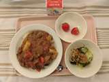 ビーフカレーライス わかめサラダ いちご 牛乳 七分つき米(岩手) にんにく(...