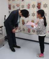 1年生の児童が、ピアノのコンクールで銅賞になりトロフィーをもらったので、見せに来...