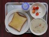 朝食の時間になりました。ハイキングに行くために、たくさん食べます。子どもたちは、...