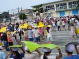 校庭で、80周年の記念写真を撮りました。前半は、各自色のついたカードを持って、上...