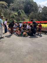 花壇の前で記念撮影です。 とても、良い天気です。
