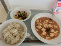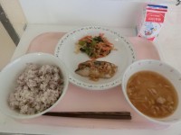 本日の給食は、「ごはん、いわしのかば焼き、野菜のごま酢和え、呉汁、牛乳」です