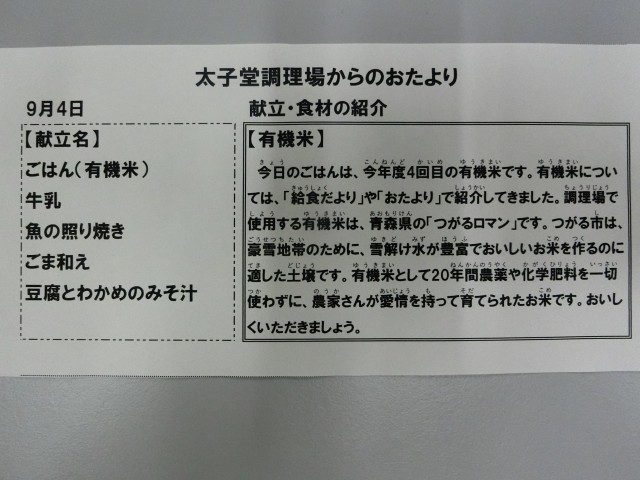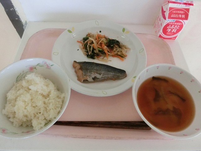本日の給食は、「ごはん(有機米)、魚の照り焼き、ごま和え、豆腐とわかめのみそ汁、牛乳」です