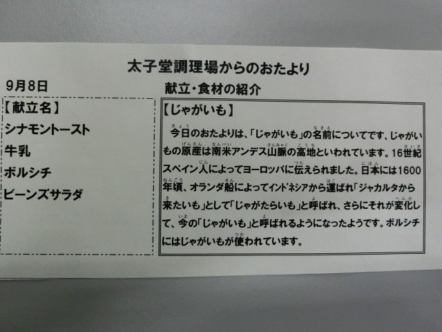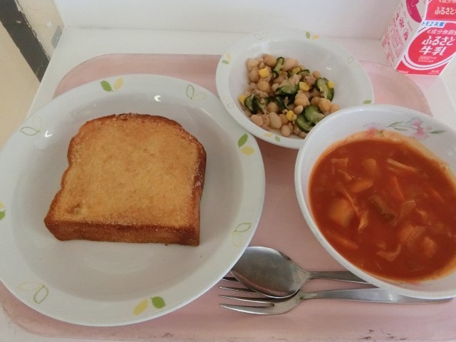 本日の給食は、「シナモントースト、ボルシチ、ビーンズサラダ、牛乳」です