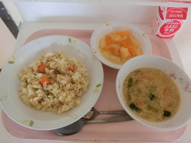 本日の給食は、「シーフードピラフ、卵と青菜のスープ、フルーツポンチ、牛乳」です