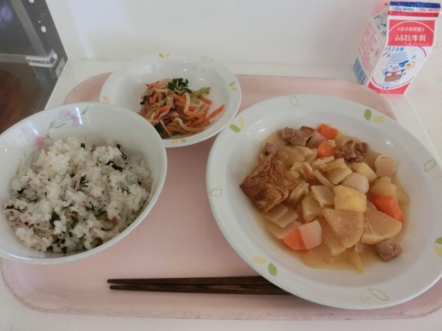 本日の給食は、「梅とわかめのごはん、豚肉と大根のうま煮、野菜のおかか和え、牛乳」です
