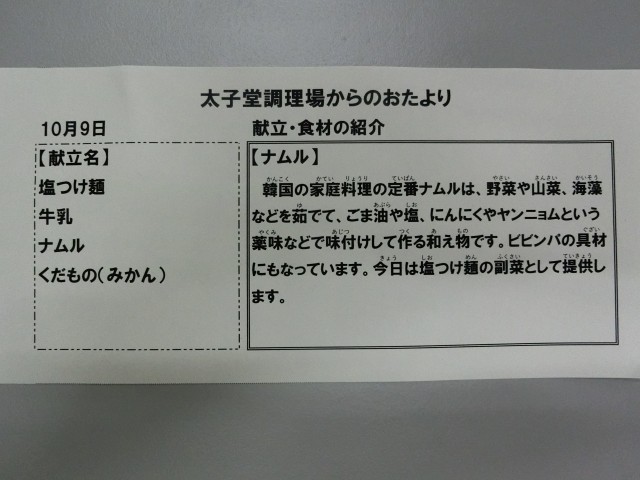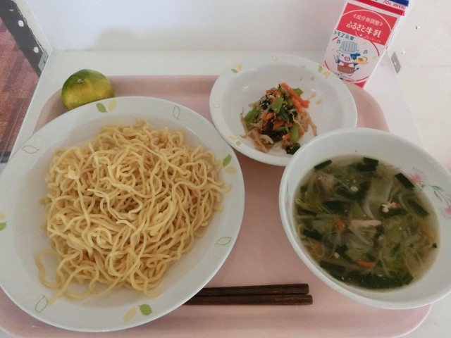 本日の給食は、「塩つけ麺、ナムル、くだもの(みかん)、牛乳」です