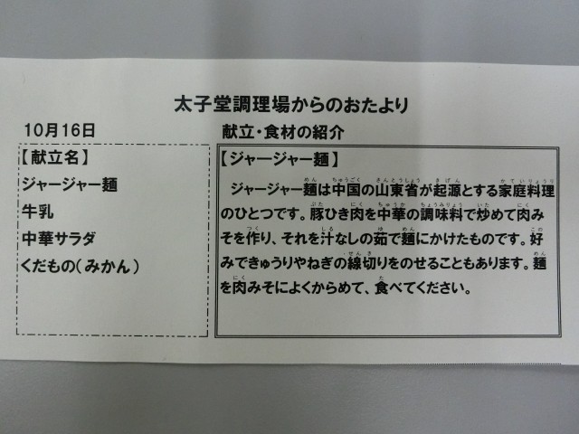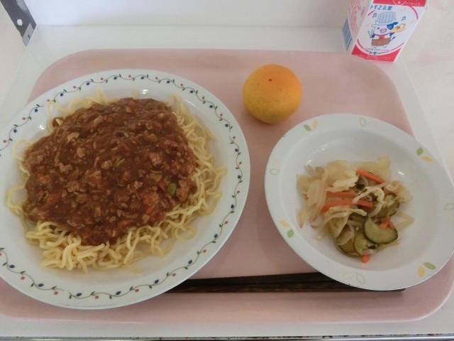 本日の給食は、「ジャージャー麺、中華サラダ、くだもの(みかん)、牛乳」です