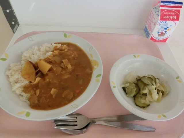 本日の給食は、「秋野菜のカレーライス、オニオンサラダ、牛乳」です