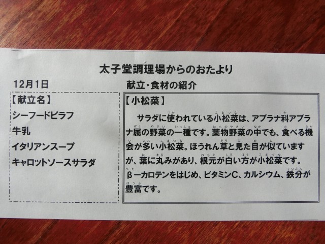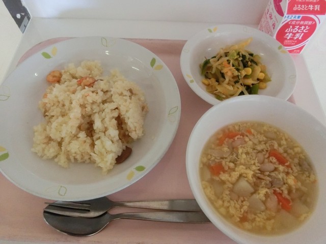 本日の給食は、「シーフードピラフ、イタリアンスープ、キャロットソースサラダ、牛乳」です