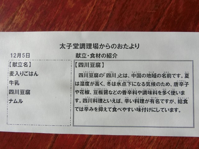 本日の給食は、「麦入りごはん、四川豆腐、ナムル、牛乳」です