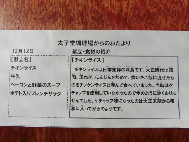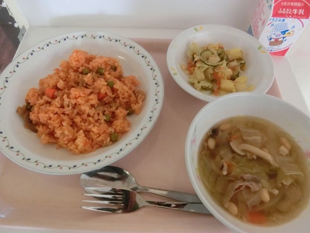 本日の給食は、「チキンライス、ベーコンと野菜のスープ、ポテト入りフレンチサラダ、牛乳」です