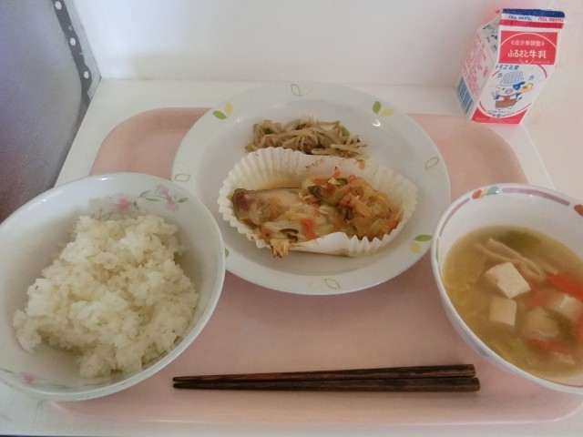 本日の給食は、「ごはん(有機米)、鮭のちゃんちゃん焼き、もやしとにらのごま和え、豆腐汁、牛乳」です