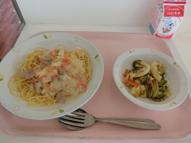 本日の給食は、「スパゲッティクリームソース、ツナサラダ、牛乳」です。