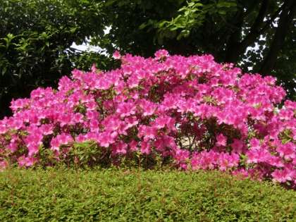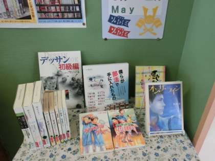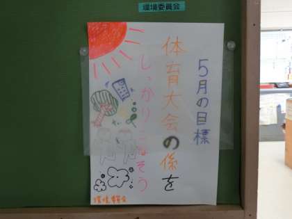 環境委員会が作った「5月の目標」。図書館には5月のおすすめ本。正門横のツツジはこんなに綺麗です。