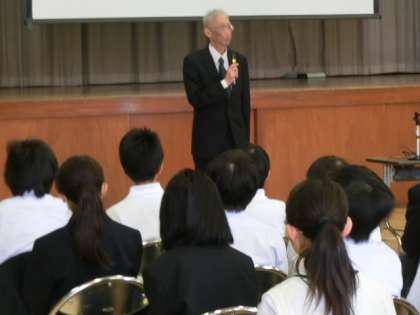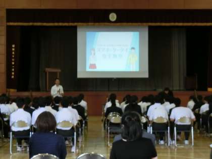 携帯電話やスマホ、インターネットのトラブルが増えていますので、生徒が犯罪に巻き込まれないように、NTTdocomoのケータイ安全教室講師の方にいらして頂き、保護者・地域の方々も参加して行いました。持たせたら、ご家庭でしっかりルールを守らせてください。