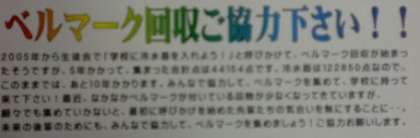 2005年から生徒会で「学校に冷水器を入れよう!」と呼びかけて、ベルマーク回収が始まったそうですが、5年かかって、集まった合計点は44154点です。冷水器は122850点なので、このままでは、あと10年かかります。みんなで協力して、ベルマークを集めて、学校に持って来て下さい!最近、なかなかベルマークが付いている品物が少なくなってきていますが、