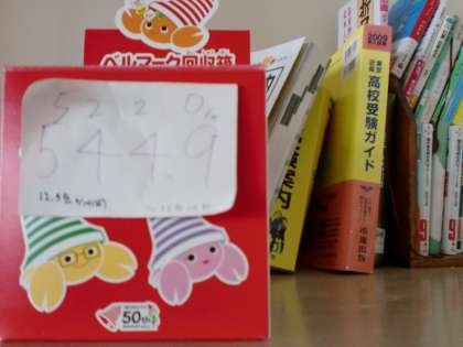 写真は、1年、2年、3年の各教室にある「ベルマーク入れの箱」です。 それぞれに、生徒に、クラスに、学年によって個性があるように、それぞれ趣のある箱となっています。